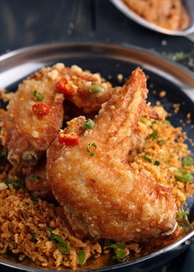 Standout dishes include chicken wings fragranced with five-spice powder (a traditional Chinese spice blend) and richly flavored, aged original char siu. Freshly steamed dim sum is perfect both for a light bite and as a companion to beer.