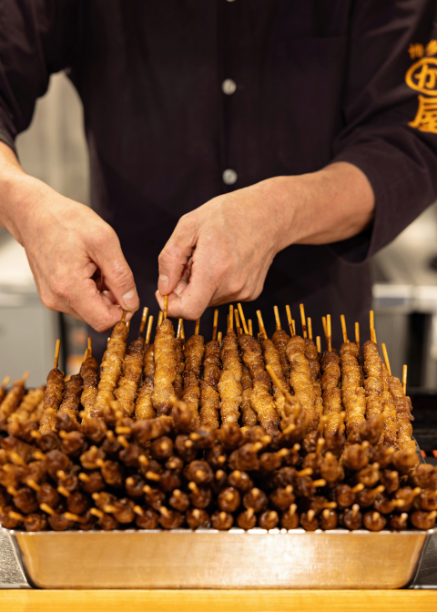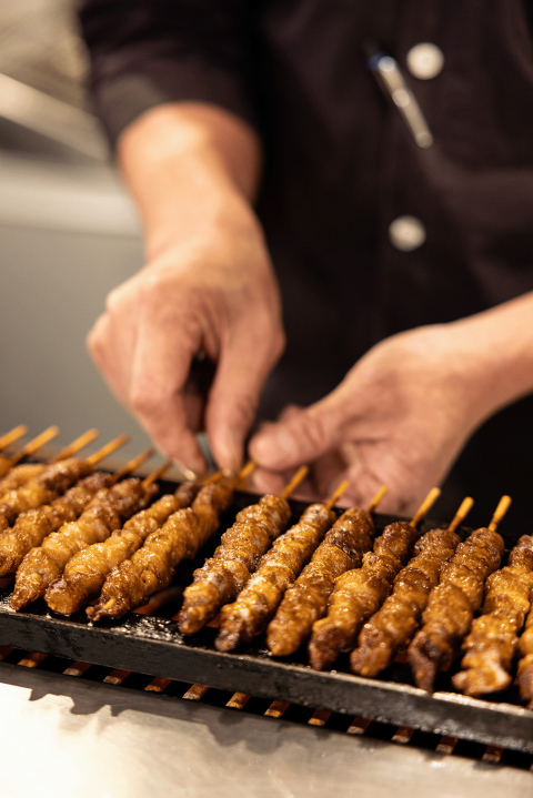 こだわりの〈名代かわ焼き(とり皮)〉は、外はカリッと香ばしく、中はもっちりとした食感が魅力です。