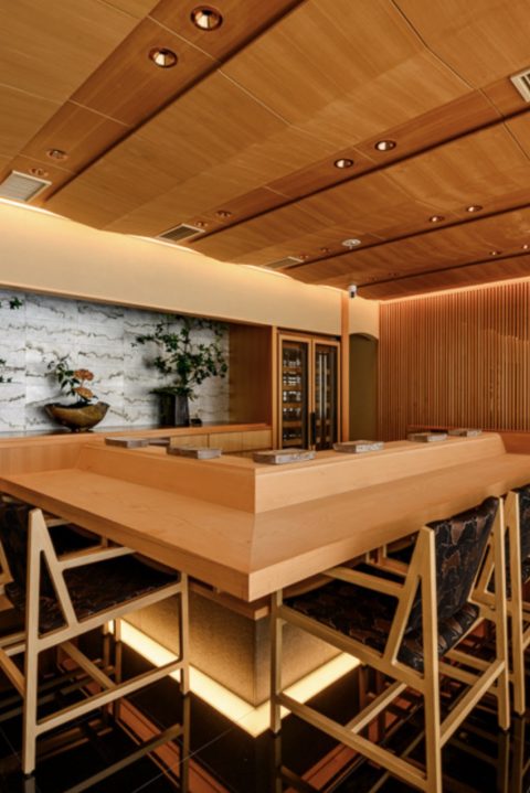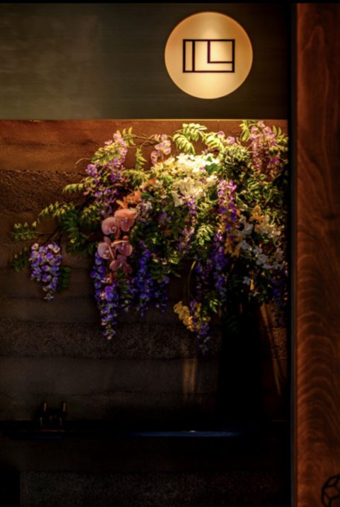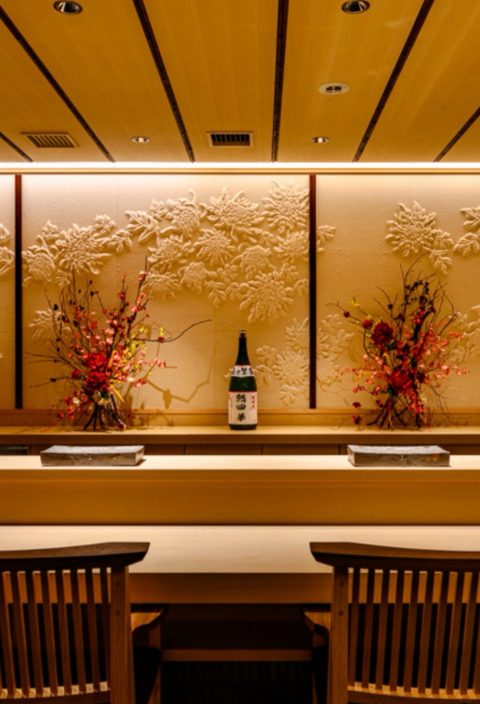 扉の向こうに広がるのは、木の温もりを感じる広々としたカウンター。和モダンな店内に、季節の花々が彩りを添えています。
