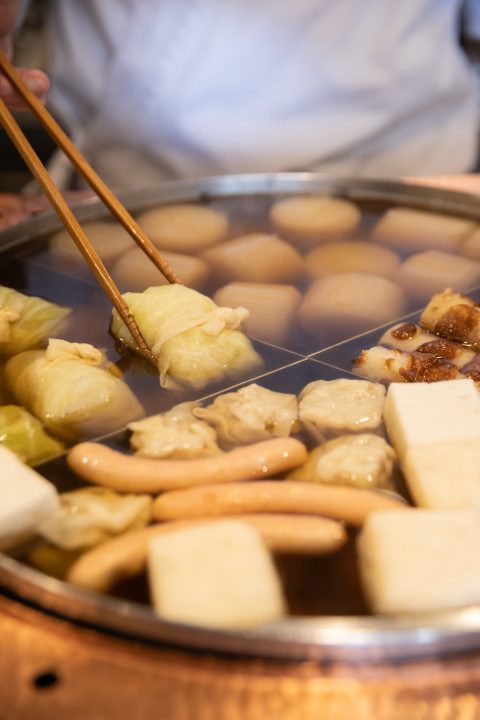 同店に訪れたなら、豚しゃぶと並ぶ看板料理〈おでん各種〉¥300(税込)~も外せません。大根や玉子といった定番から、シュウマイ、蓮根挟み揚げなどオリジナルの創作おでんまで、リーズナブルな価格で堪能することができます。