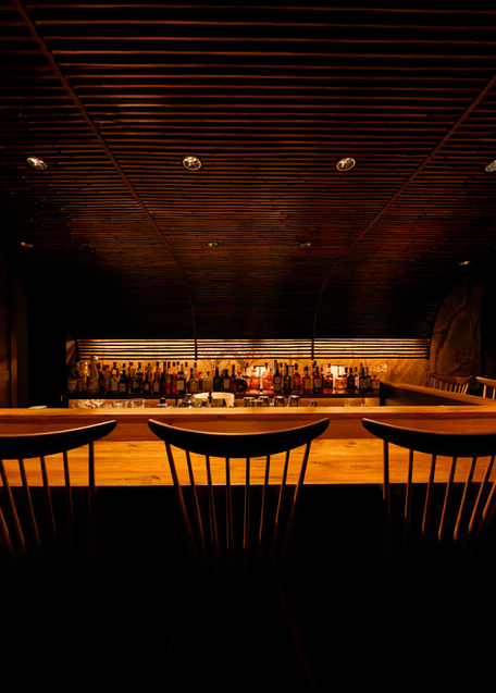 併設の「Bar Trillion(バー トリリオン)」は「鮨処 乾杯」の奥に位置する静かな空間で、照明や木の質感が上品に調和した和モダンなインテリアが特徴の大人の隠れ家バーです。