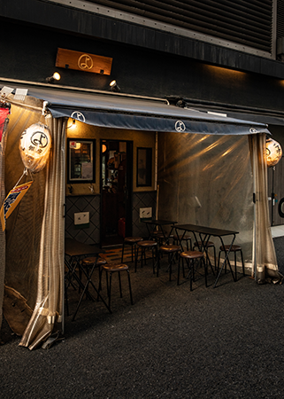 首都高速道路の下、細い路地に面して店舗が立ち並ぶ中央に、濃紺のテントと大きな提灯が見えてくる。