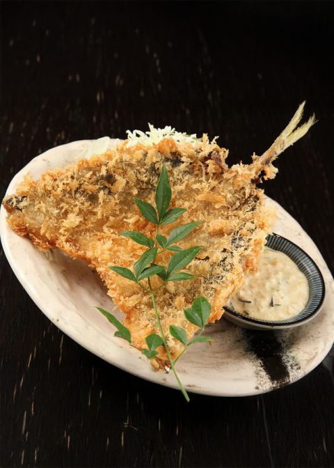 招牌〈手工特製巨型竹筴魚天婦羅〉亦不可錯過。酥脆香氣四溢的麵衣下,藏著厚實飽滿的魚肉鮮味,一口咬下便令人會心微笑的絕品。