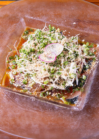 另有直送自長崎雲仙的〈芝麻鯖魚〉。以柴魚乾飼養的「雲仙柴魚鯖」風味濃郁,與芝麻醬汁堪稱絕配。