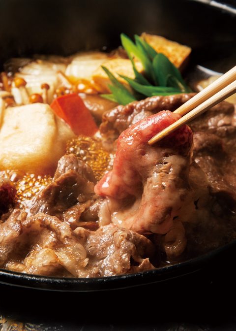嚴選上等裡脊肉,在醬油與砂糖調製的湯底中輕涮,蘸上濃郁的蛋液後享用。